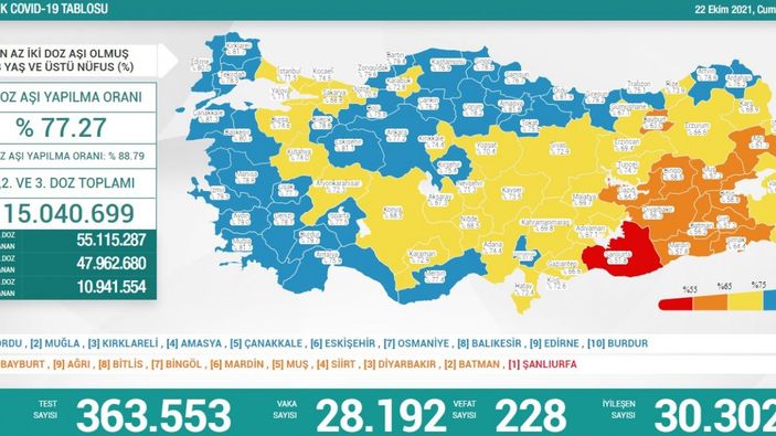 Buna göre; Türkiye'de son 24 saatte 363 bin 553 Kovid-19 testi yapıldı, 28 bin 192 kişinin testi pozitif çıktı, 228 kişi hayatını kaybetti.