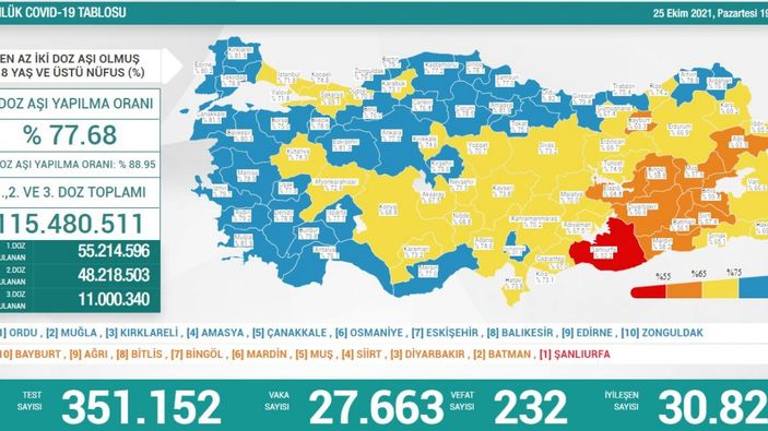 Buna göre; Türkiye'de son 24 saatte 351 bin 152 Kovid-19 testi yapıldı, 27 bin 663 kişinin testi pozitif çıktı, 232 kişi hayatını kaybetti.