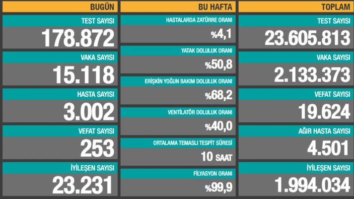 Türkiye'de bugün koronavirüs salgınında 253 vatandaşımız yaşamını yitirdi. Ayrıca son 24 saatte 15 bin 118 de yeni vaka tespit edildi.