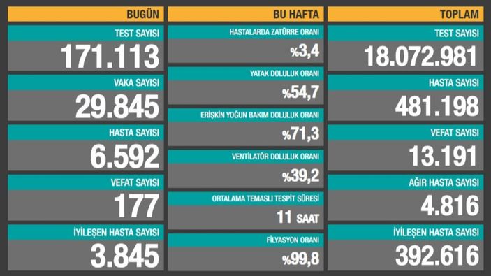 Koca'nın paylaştığı tabloya göre bugün yapılan testler sonucu 29 bin 845 kişinin daha koronavirüs test sonucu pozitif çıktı.