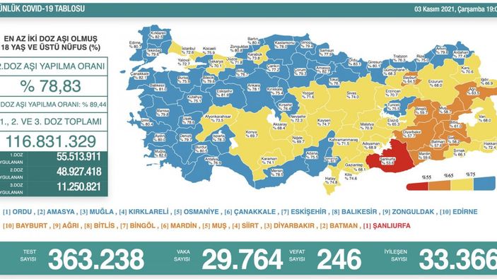 Toplamda uygulanan 1. doz aşı miktarı 55 milyon 513 bin 911, 2. doz uygulanan aşı miktarı 48 milyon 927 bin 418, 3.doz uygulanan aşı miktarı ise 11 milyon 250 bin 821 oldu.