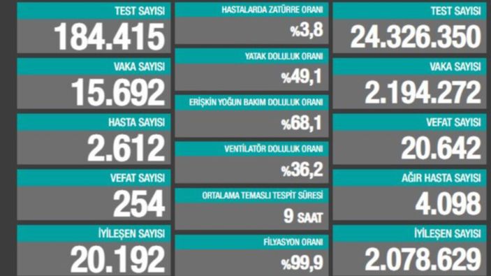 Türkiye'de bugün koronavirüs salgını nedeniyle 254 vatandaşımız yaşamını yitirdi. Ayrıca son 24 saatte 15 bin 692 de yeni vaka tespit edildi.