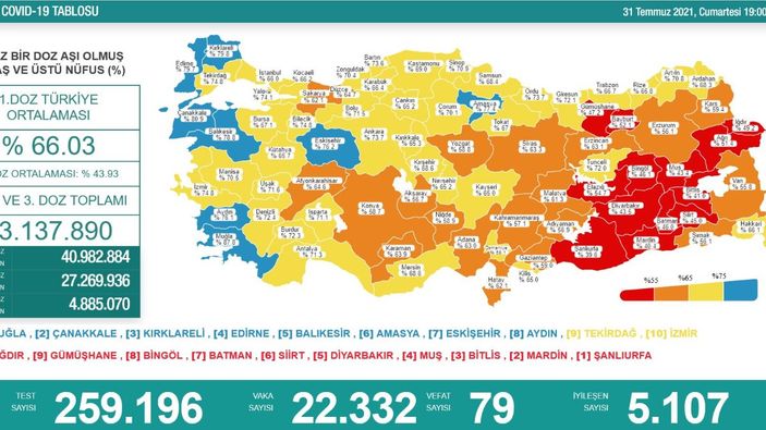 Buna göre; Türkiye'de son 24 saatte 259 bin 196 Kovid-19 testi yapıldı, 22 bin 332 kişinin testi pozitif çıktı, 79 kişi hayatını kaybetti.