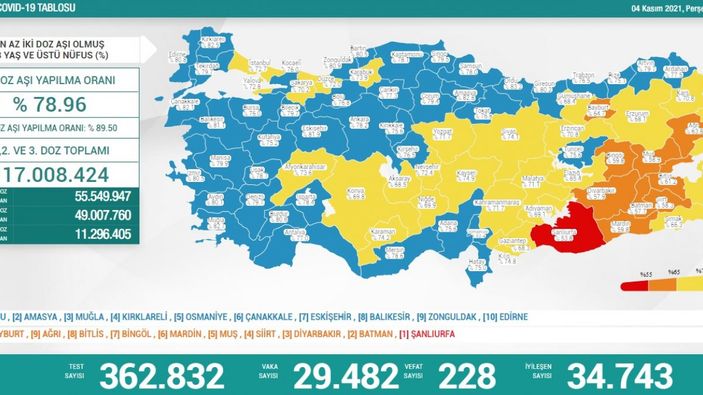 Buna göre; Türkiye'de son 24 saatte 362 bin 832 Kovid-19 testi yapıldı, 29 bin 482 kişinin testi pozitif çıktı, 228 kişi hayatını kaybetti.