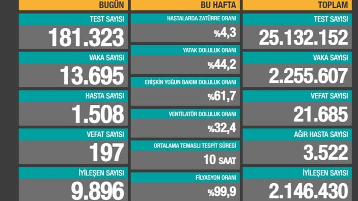 Koca'nın paylaştığı tabloya göre bugün yapılan testler sonucu 13 bin 695 kişinin virüse yakalandığı belirlendi.