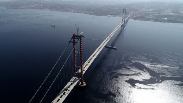 Yarın, Avrupa ve Asya yakalarındaki 318 metre yüksekliğe sahip kulelerin ayaklarında, birbirine kaynatılmış bekleyen toplam 6 tabliyenin montajıyla araç geçiş yolu tamamlanmış olacak.