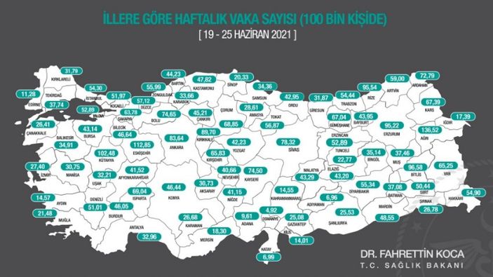 Bakan Koca'nın yaptığı paylaşımda, 19-25 Haziran arasında illere göre her 100 bin kişide görülen koronavirüs vaka sayılarını açıklandı.