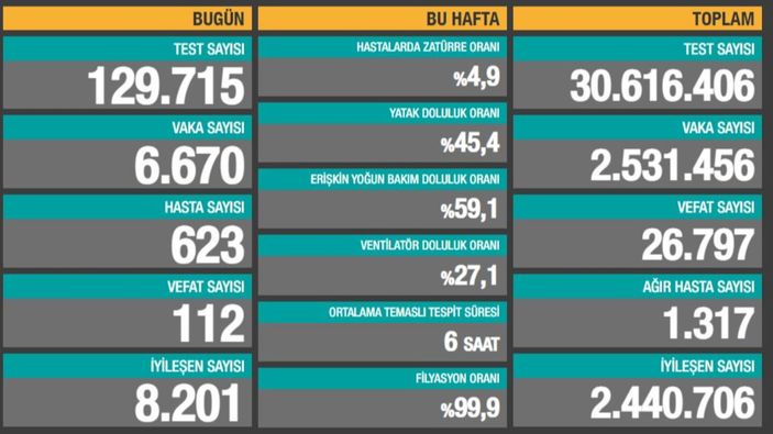 Yayınlanan tabloya göre bugün yapılan testler sonucu 6 bin 670 yeni vaka tespit edildi.