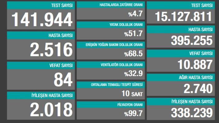 Fahrettin Koca paylaşımını, "Bugün tespit edilen 2.516 yeni hastamız var. Ağır hasta sayımız 2.740’a ulaştı. Bugün taburcu olan 2.000’den fazla iyileşen hastamız oldu. Zorunlu olmadıkça kalabalık ortamlardan uzak durun. Hijyene dikkat edin. Maske kullanın." notuyla yaptı.