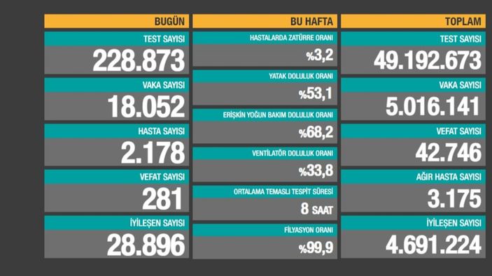 Türkiye'de koronavirüs salgınında bugün 18 bin 52 yeni vaka tespit edilirken, 281 vatandaşımız da yaşamını yitirdi.