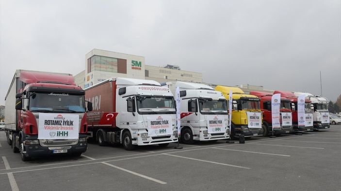 Konuşmaların ardından İstanbul, Bursa ve Konya başta olmak üzere tüm Türkiye’den hareket eden insani yardım tırları Suriye’ye uğurlandı. Tırların içerisinde giysi, ayakkabı, gıda, un, okul sırası, yazı tahtası, kırtasiye malzemesi, soba, kömür, battaniye, hijyen paketleri, tıbbi malzeme ve sünger yatak bulunuyor.