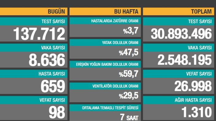 98 vatandaşımızın da salgına yenik düşmesiyle toplam can kaybı 26 bin 998'e yükseldi.