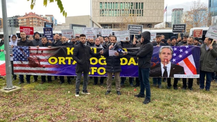 ABD Ankara Büyükelçiliği önünde toplanan sivil toplum kuruluşları, Ankara'da bulunan ABD Dışişleri Bakanı Antony Blinken'ı İsrail'in Filistin'e uyguladığı zulüm nedeniyle protesto etti.