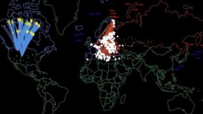 Princeton Bilim ve Küresel Güvenlik programında (SGS) yapılan araştırma sonucunda yapılan simülasyon, nükleer yıkımın ilk saatlerinde 34 milyon insanın öldürüleceğini ve 57 milyon kişinin yaralanacağını öne sürüyor. Bu sayıya nükleer serpinti veya diğer uzun vadeli sorunlar nedeniyle hastalananlar dahil değil. Animasyonda, (nükleer patlamaları temsil eden) beyaz dairelerle dolu bir desen oluşmadan önce balistik füzelerin elektronik rotaları görülüyor.