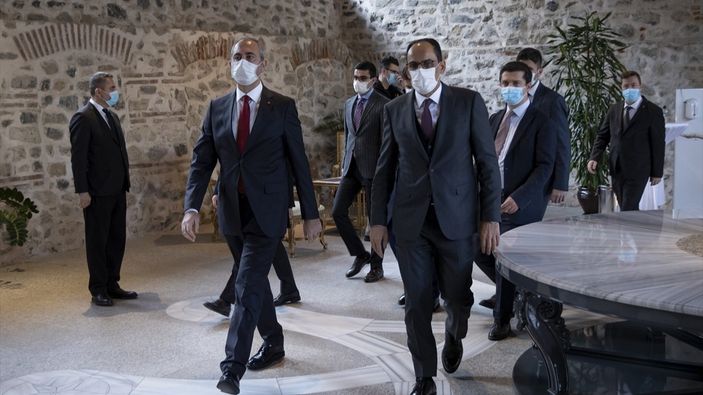 Gül ve Kalın, Cumhurbaşkanlığı Dolmabahçe Çalışma Ofisi'nde gerçekleşen toplantı öncesinde katılımcıları sosyal mesafe kuralına uyarak tek tek selamladı.