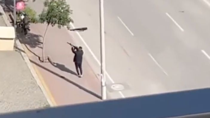 Uzun namlulu bir silahla bina önüne gelen saldırganın nişan alarak binayı taradığı görülüyor.