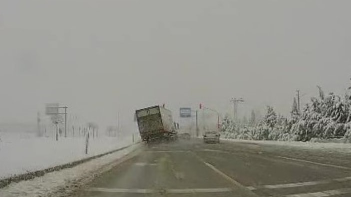 Amasya-Merzifon yolunda kar yağışının etkili olduğu sabah saatlerinde, bir tır sürücüsü yavaşlayan otomobile çarpmamak için ani bir manevra yaptı.