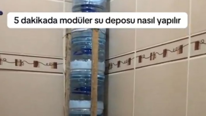 Ankara'da bitmek bilmeyen su kesintileri sonrası bir vatandaş, evinde kendisi önlem aldı. Su bidonlarını tek tek dizen vatandaş, "5 dakikada modüler su deposu nasıl yapılır?" dedi.