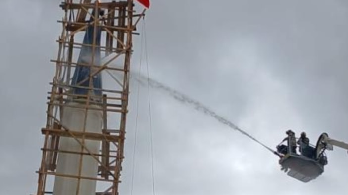 Olay yerine sevk edilen ekipler, minaredeki yangına kısa sürede müdahale etti.