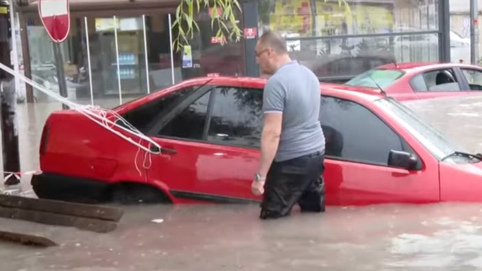 Kameralar kayıttayken kavşaktan geçmeye çalışan bir aracın sulara kapılması ile araçtakiler panikle aracı terk ettiği.
