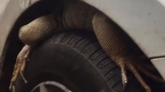 Antalya'da bir sürücünün, park halindeki otomobilinin ön tekeri ile kaportasının arasına giren iguanayı çıkarmaya çalıştığı anlar, cep telefonu kamerasıyla görüntülendi.