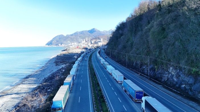 Türkiye'nin Kafkaslar ve Orta Asya'ya açılan kapısı Sarp Sınır Kapısı'nda geçiş yapmak için sıra bekleyen tırlar, Artvin'in Hopa ilçesinde uzun bir kuyruk oluşturdu.