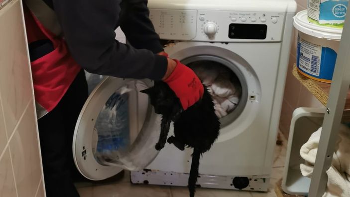 Sahibinin fark etmemesi üzerine yorganla birlikte çamaşır makinesine atılan kedi, itfaiye ekiplerinin yardımıyla kurtarıldı.