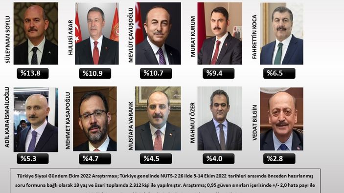 ASAL Araştırma, 5-14 Ekim 2022 tarihleri arasında gerçekleştirdiği anketinde katılımcılara ''Cumhurbaşkanlığı Kabinesi'nde en çok beğendiğiniz bakan hangisidir?'' sorusunu yöneltti.