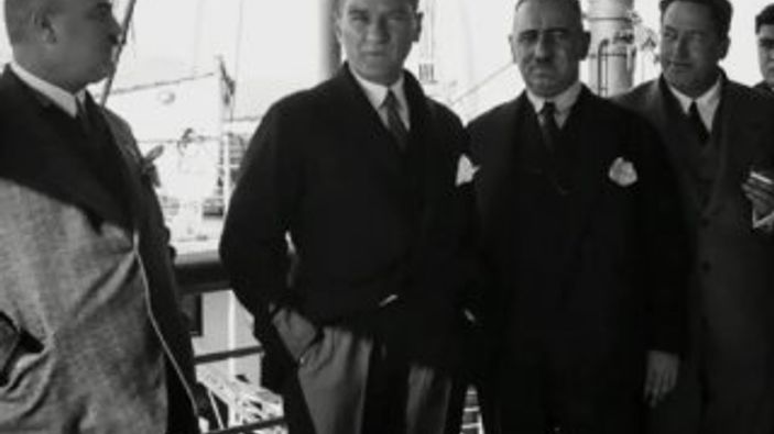 Atatürk'ün genç cumhuriyetin geleceğine ilişkin önemli mesajlar verdiği Trabzon seyahatlerinin ikincisinde çekilen 1930 Kasım ayına ait görüntüde; Ulu Önder, Ege Vapuru'nda çocukluk arkadaşı ve ona en yakın isimlerden Salih Bozok, yanından hiç ayırmadığı Kılıç Ali ve başyaveri Cevat Abbas Gürer ile sohbet ederken görülüyor.