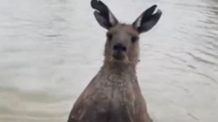 Nehirde bulunan 2 metre boyundaki kanguru, bir köpek ve sahibine zor anlar yaşattı.