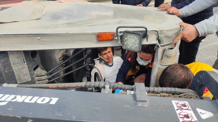 Devrilen aracın altında kalan genç işçi, çevredekilerin yardımıyla kurtarıldı.