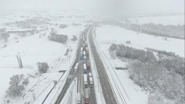 Balıkesir - Bursa kara yolunda 25 kilometrelik kar kuyruğu VİDEO