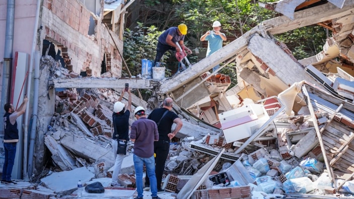 Yıkılan binada enkazda kalan 4 kişi, arama kurtarma ekiplerinin çalışmasıyla kurtarıldı.