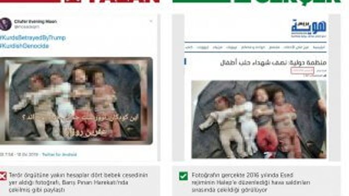 Terör örgütü yanlısı hesapların, "Kürtler Trump'ın ihanetine uğradı" başlıklı bir etiketle paylaşarak manipüle etmeye çalıştığı, dört bebek cesedinin yer aldığı acı karenin, Esad rejiminin Halep'e düzenlediği hava saldırıları sırasında, Eylül 2016'da çekildiği anlaşıldı.