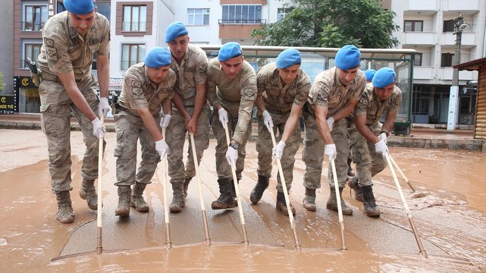 Yoğun yağmur nedeniyle Bartın'da yaşanan sel felaketinin ardından başlatılan çalışmalarda bölgede görevli Mehmetçik de yer aldı. Askerler sokakların temizlenmesine yardım etti.