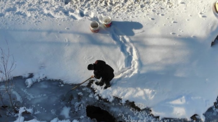 Köyde yaşayanlar, kürek ve kazmalarla kırdıkları buz tabakasının altından çıkan suyu kovalarla hayvanlarına taşıdı.