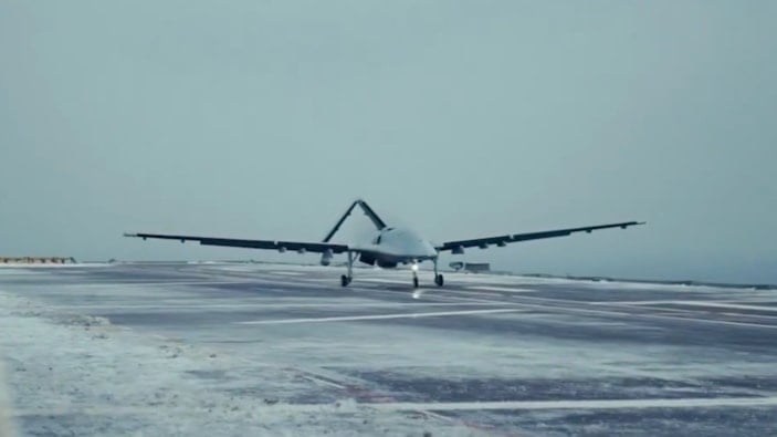 Şiddetli rüzgarın deniz üzerinde yarattığı türbülanslı ortama rağmen kararlı uçuş karakteristiğini koruyan milli SİHA, uçuş görevini başarıyla tamamlayarak şiddetli soğuk nedeniyle buz tutan pisti temizlenen TCG ANADOLU'ya otonom iniş gerçekleştirdi.