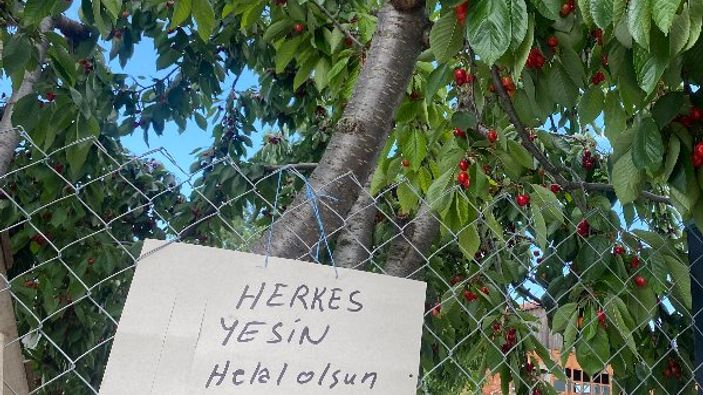 Bilecik’in Pazaryeri'nde bir vatandaşın, bahçesindeki kiraz ağacının altına ‘Herkes yesin, helal olsun. Dallarını kırmayın’ yazılı not bırakması görenlerin takdirini kazandı.