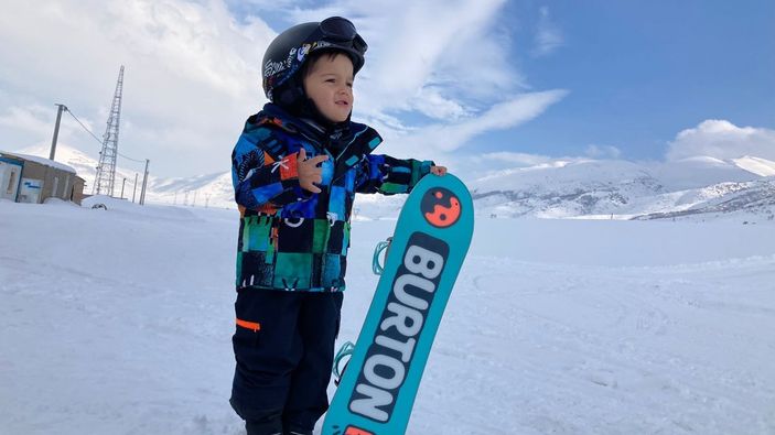 Bitlis'in Güroymak ilçesinde yaşayan 2 yaşındaki Ali Uras Kaya, snowboarddaki ustalığıyla kendine hayran bırakıyor.