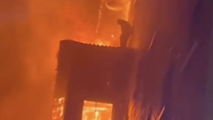 Yangın esnasında çatıya çıkarak kurtulmayı bekleyen adamın çaresiz halleri, vatandaşların kamerasına yansıdı.
