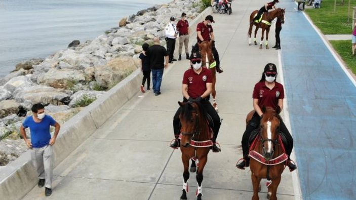 Vatandaşlar tarafından büyük ilgiyle karşılaşan atlı polis ekipleri, yaşanabilecek olumsuzluklara karşı devriye gezdi. Sahilde 4 kişilik gruplar halinde gezen ekipler koronavirüs tedbirleri kapsamında vatandaşları sosyal mesafe konusunda uyardı. Ekipler sahilde devriye attığı esnada maske takmayan vatandaşları uyarıp kurallara uymaları noktasında ikaz etti.