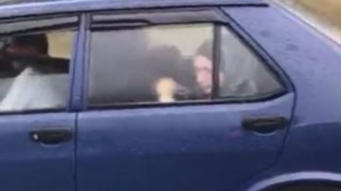 Görüntülerde yağmur altında hızla ilerleyen otomobilin bozuk sileceklerinin, arka koltukta oturanlar tarafından iple çekilerek kontrol edildiği görülüyor.