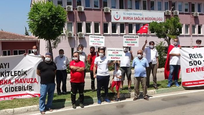 Ellerinde pankartlarla Bursa İl Sağlık müdürlüğü önüne gelen halı saha işletmecileri zor durumda olduklarını normalleşme süreciyle birlikte kendi işletmelerinin de açılmasını istediklerini belirtti.