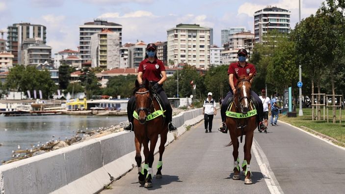 Çevik Kuvvet Şube Müdürlüğü'ne bağlı Atlı Birlik Grup Amirliği ekipleri, özellikle hafta sonları vatandaşların yoğun olarak bulunduğu Caddebostan Sahili'nde devriye gezdi.