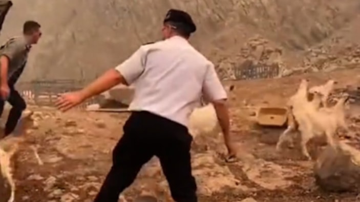Dünden bu yana devam eden orman yangınından insanlar kadar hayvanlar da etkilendi. Sosyal medyada paylaşılan bir görüntüde cesur komutanın, alevlerin arasında kalan hayvanlar için canı pahasına mücadele ettiği görüldü.