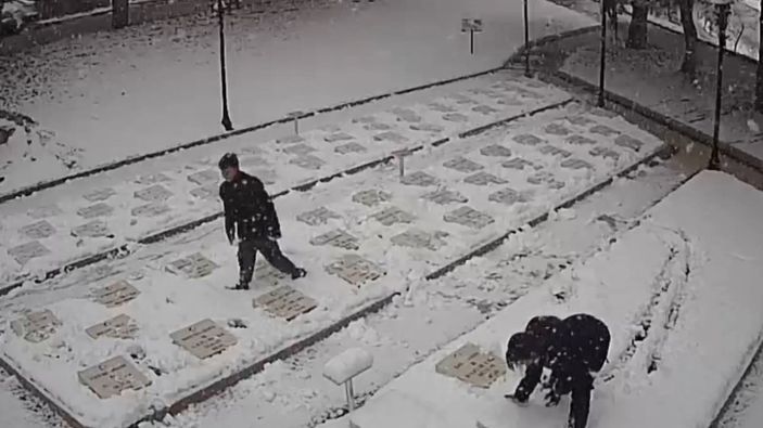 Anıta 15.00 sularında gelen 2 genç, karla kaplanan mezar taşlarını elleriyle temizledi.