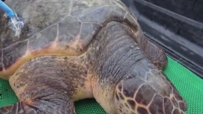 Yaklaşık 150 kilogram olan caretta caretta gerekli kontrol ve muayenelerinin tamamlanmasının ardından yeniden denize bırakıldı.
