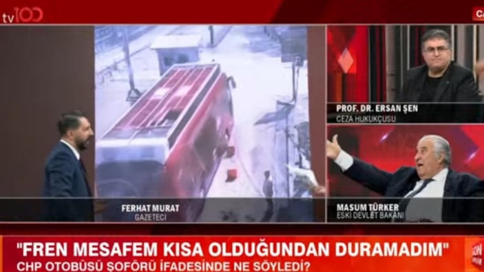 Tv100 canlı yayınında, Ankara'da CHP otobüsünün polisin üzerine sürüldüğü anlara ait EGM görüntüleri "gerçek mi değil mi" diye tartışıldı.
