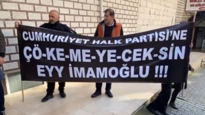 Gazi Cemevi önünde toplanan grup, tepkisini ellerindeki "Cumhuriyet Halk Partisi'ne çökemeyeceksin ey İmamoğlu" "İhanet işte o gün başladı" yazılı pankartlarla gösterdi.
