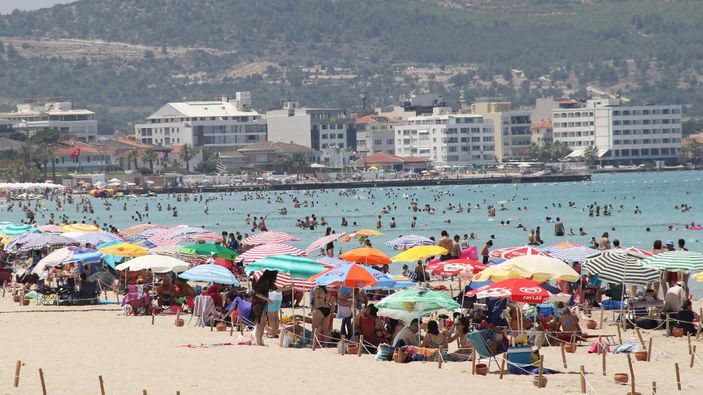 Hissedilen sıcaklığın 45 dereceyi bulduğu Ilıca Plajı’nda bazı vatandaşlar serinlemek için denize girerken, bazı vatandaşlar da plajda güneşlenmeyi tercih ediyor.